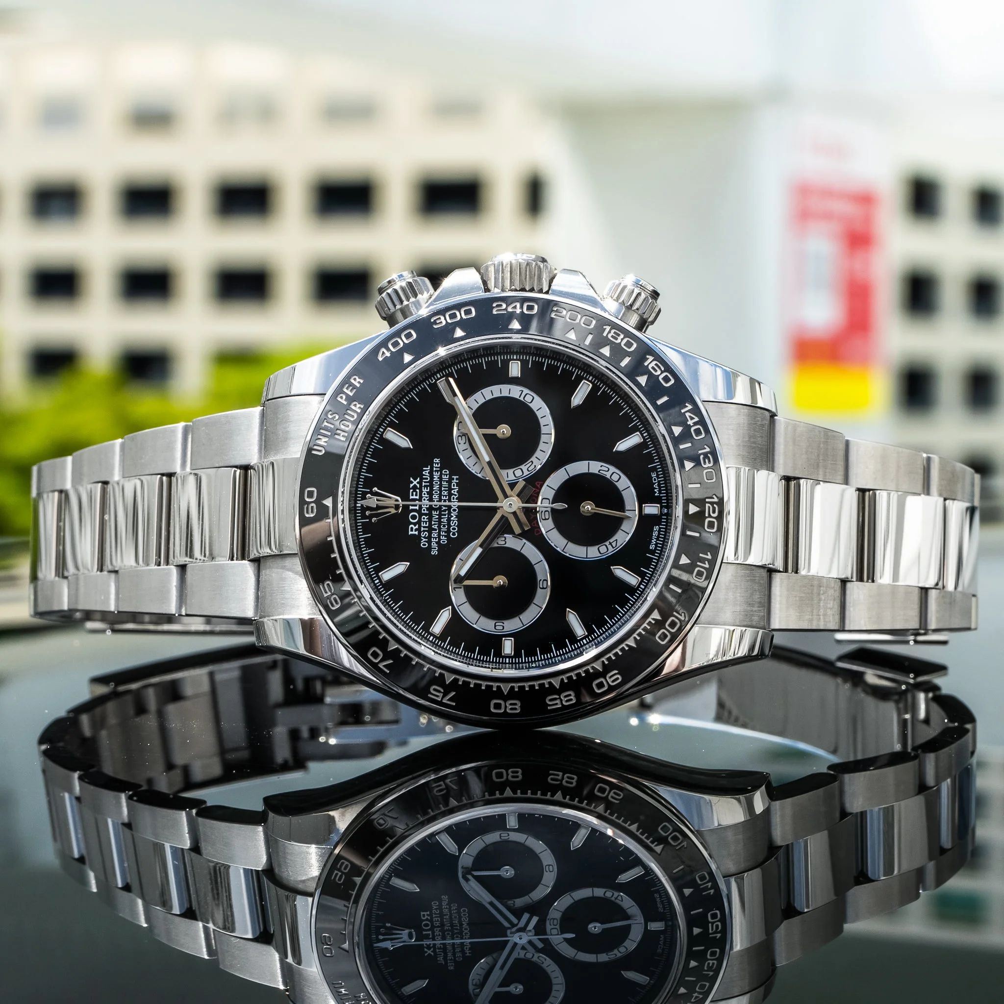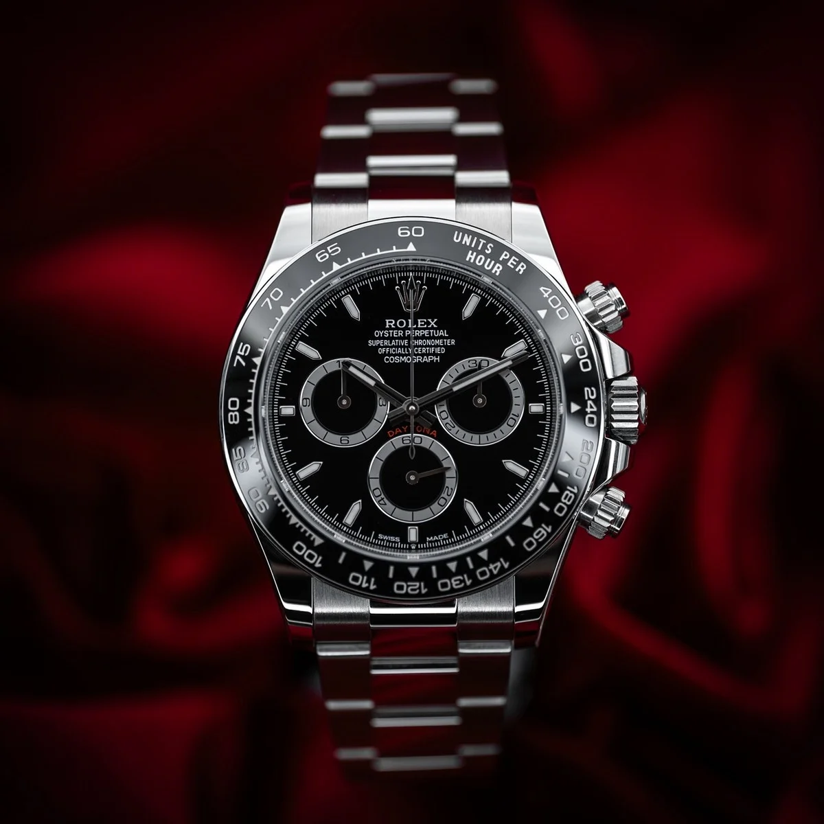 - Stainless steel Daytonas (126500LN, 116500LN): $28,000–$34,000 typical range for recent models, with black dials at lower end and panda dials commanding 20–30% premium.