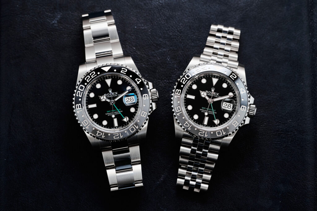 Side-by-side Rolex GMT-Master II stainless steel models showcasing Oyster and Jubilee bracelet options with black dials.